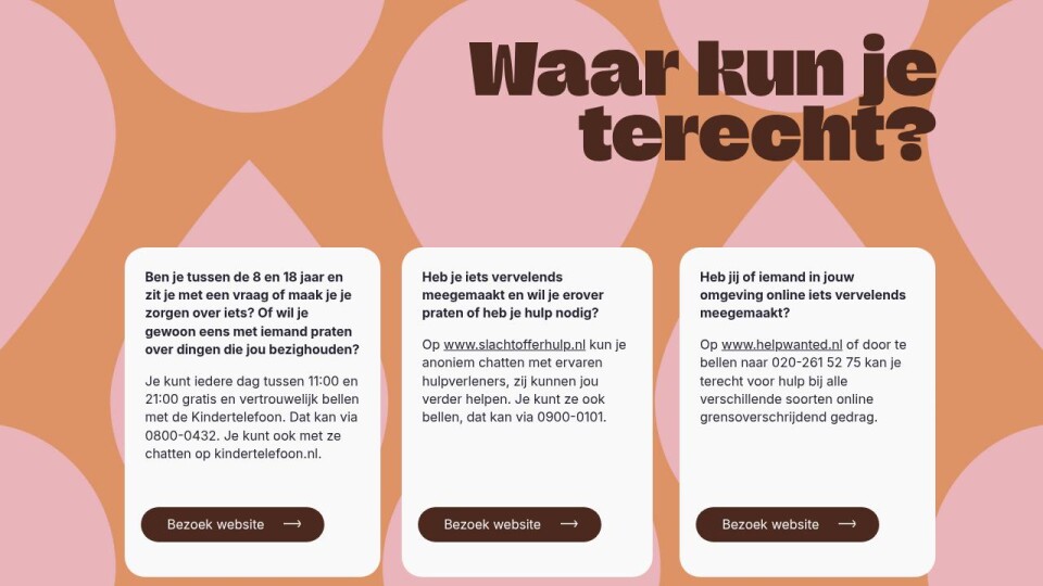 Op www.helpwanted.nl of door te bellen naar 020-261 52 75 kan je terecht voor hulp bij alle verschillende soorten online grensoverschrijdend gedrag.
