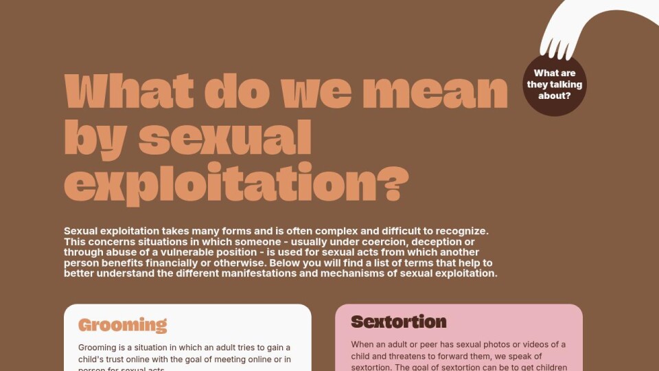 Sexual exploitation takes many forms and is often complex and difficult to recognize. This concerns situations in which someone - usually under coercion, deception or through abuse of a vulnerable position - is used for sexual acts from which another person benefits financially or otherwise. Below you will find a list of terms that help to better understand the different manifestations and mechanisms of sexual exploitation.